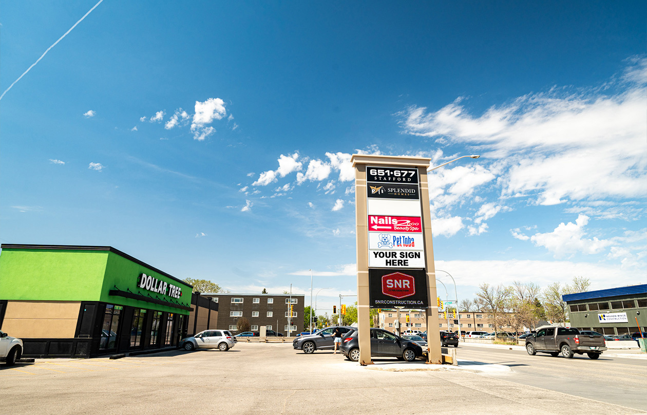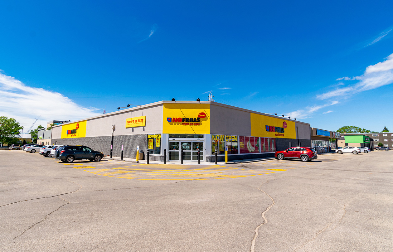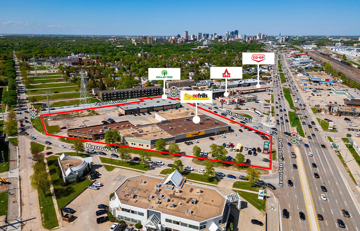 This grocery-anchored site has frontage on Pembina Highway, Stafford Street, and Harrow Street. Tenants include a recently renovated No Frills and a newer Dollar Tree. The property features three access points from major thoroughfares, ample parking, and pylon signage.